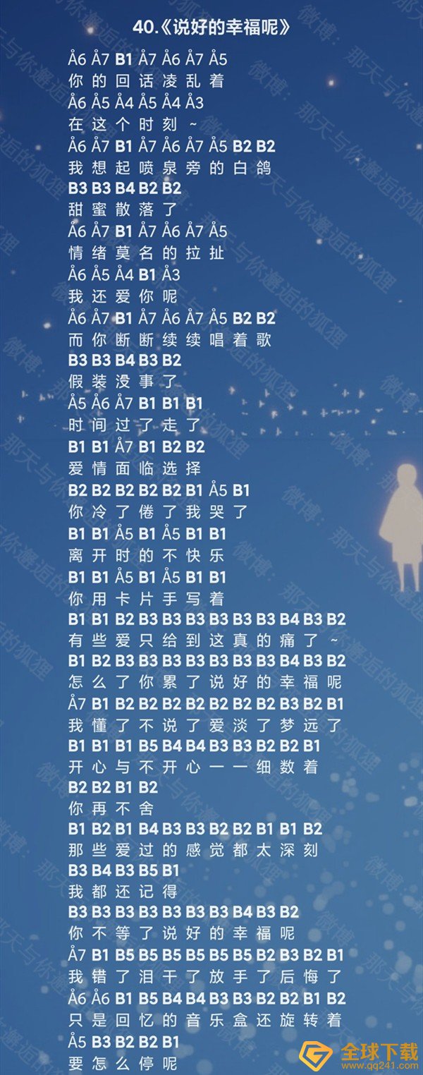 《光遇》说好的幸福呢乐谱该怎么弹?说好的幸福呢是周杰伦演唱的一首歌曲,在游戏中玩家们可以用乐器来演奏音乐,下面是全球手游网小编为你带来《光遇》说好的幸福呢乐谱详情介绍,感兴趣的小伙伴们可以来这里看一看。